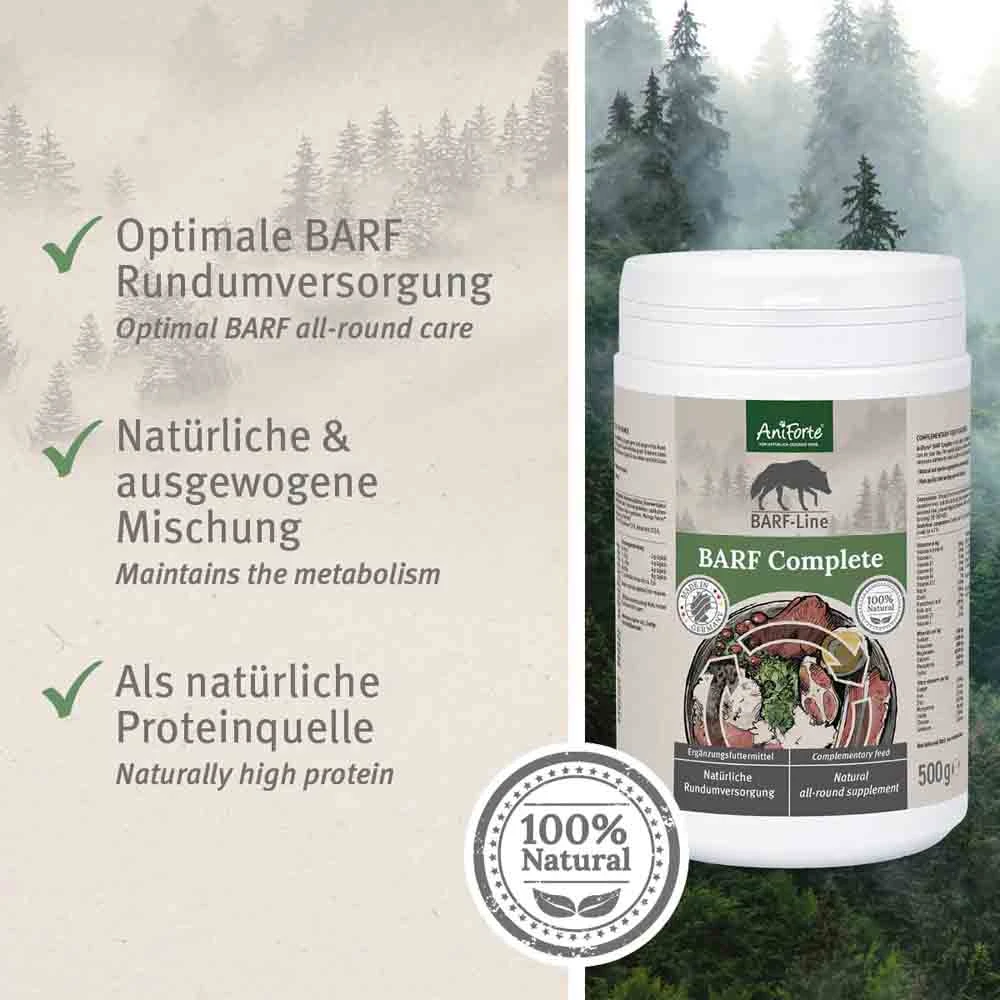 AniForte® BARF Complete ist die natürliche, ausgewogene und artgerechte Rundumversorgung für Ihren Hund. Die Spezial-Zusatz-Mischung mit Kräutern bietet Ihrem Hund die notwendigen Nährstoffe, die er täglich für ein vitales und fröhliches Hundeleben benötigt.