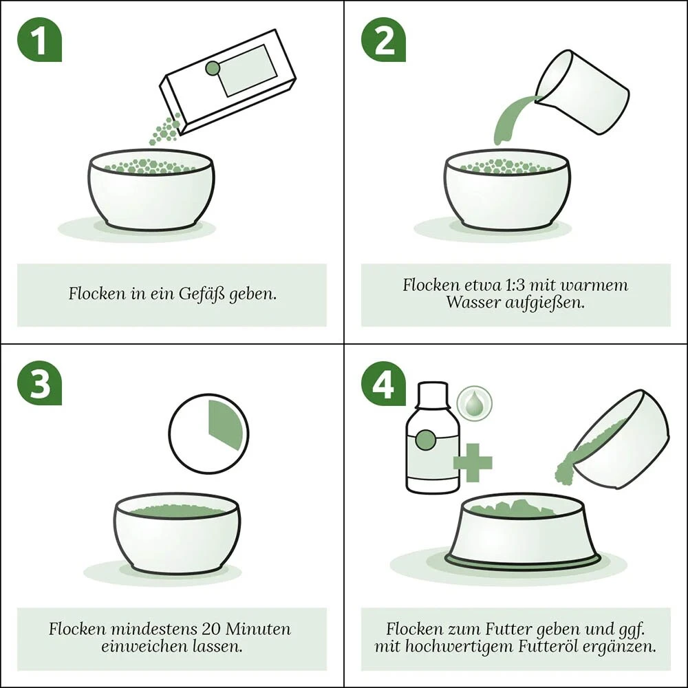 100 g der getrocknete Gemüseflocken für Hunde entsprechen ca. 250 g gequollenen Flocken.