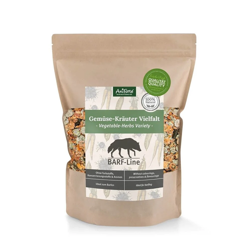 AniForte® Gemüse-Kräuter Vielfalt ist eine schonend getrocknete Mischung aus heimischen Kräutern und Gemüseflocken für Hunde. Die getreidefreie Zusammensetzung stellt eine vitale, nährstoffdichte Ergänzung für Hunde dar – ideal zum Barfen oder auch zum Mischen mit Dosenfleisch.