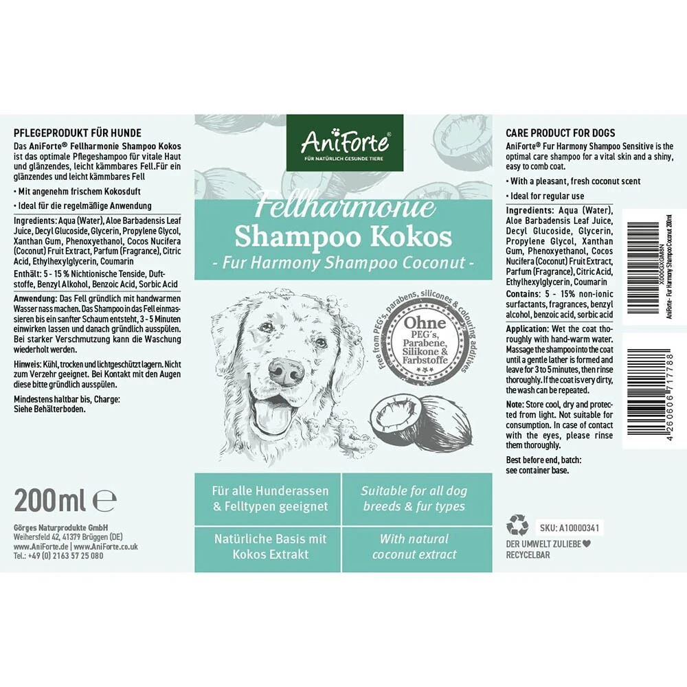 Das AniForte® Fellharmonie Shampoo mit Kokosöl-Extrakt & Aloe Vera ist das optimale Pflegeshampoo für eine vitale Hundehaut und ein glänzendes Fell.