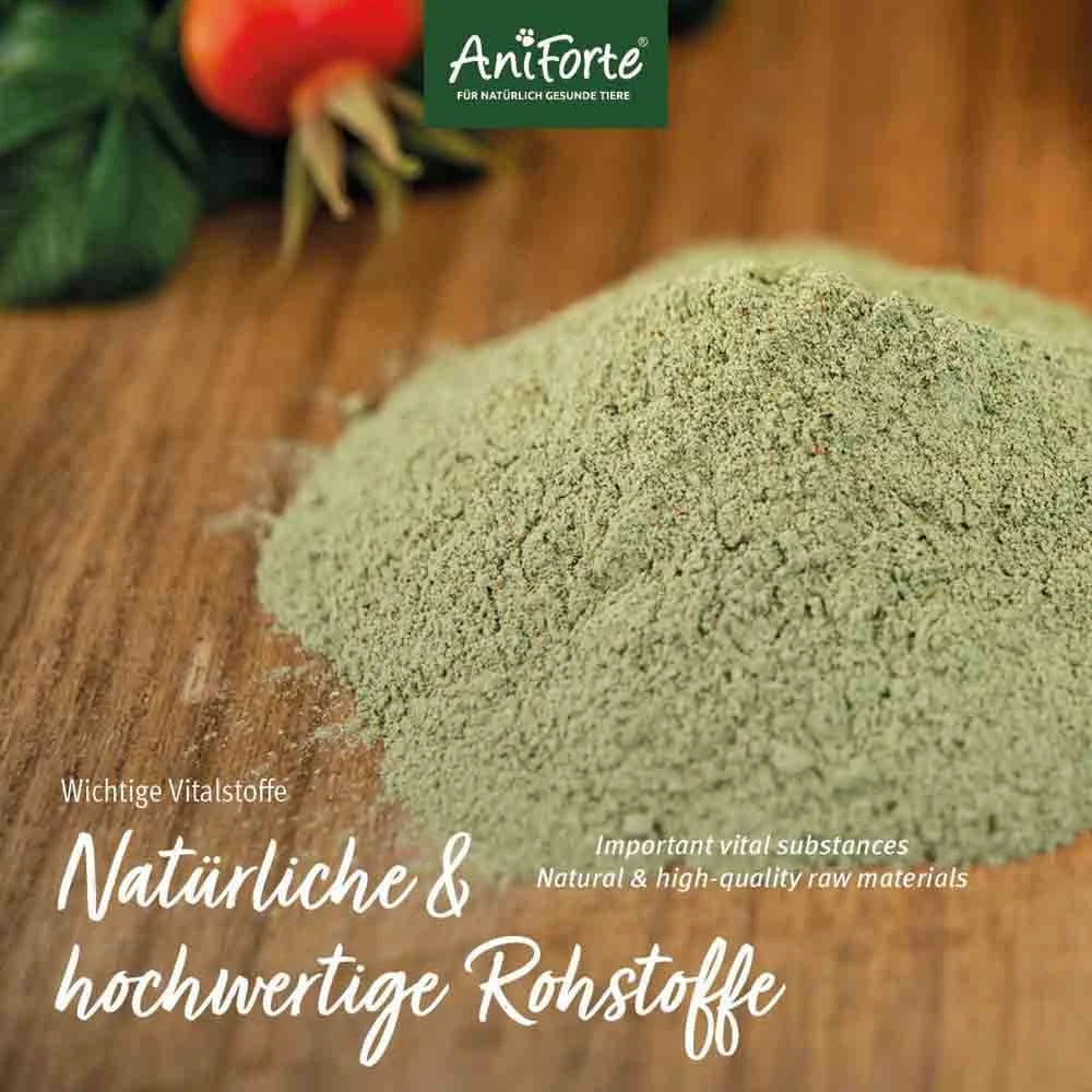 Gerstengras Pulver, Verarbeitetes tierisches Protein gemahlen (aus frischen Rinderknochen), Hagebuttenschalen Feinteile, Meeresalgenkalk gemahlen, Grünlippmuschel Pulver, Kollagen Pulver, Spirulina Pulver* (0,0034 % Vitamin A)