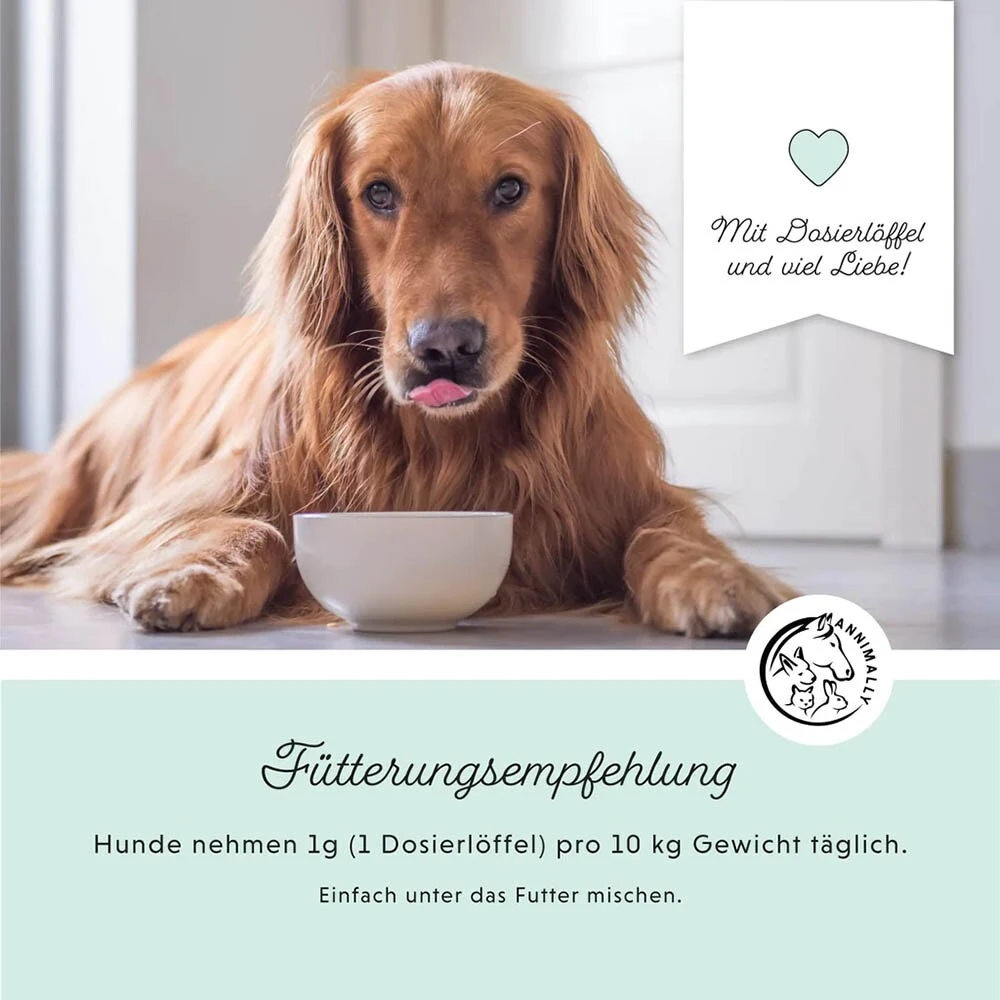 Um es Dir ganz leicht zu machen, bekommst Du mit jeder Packung einen passenden Mini-Dosierlöffel. In den passt 1 g rein. Pro 10 kg Körpergewicht fütterst Du einen Mini-Dosierlöffel täglich. Wiegt Dein Hund also 20 kg, erhält er 2 Dosierlöffel. Das Pulver kannst du einfach unter das Futter mischen.