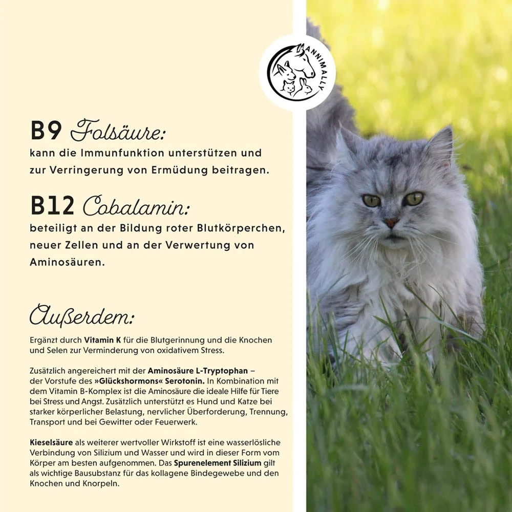 Eine angemessene Versorgung mit Vitaminen ist von besonderer Bedeutung für Katzen und Hunde, insbesondere wenn es um B-Vitamine geht. Diese Tiere müssen regelmäßig B-Vitamine aufnehmen, da der tierische Körper diese Vitamine nicht effizient speichern kann. Dabei spielen B-Vitamine eine wichtige Rolle für die Nervenfunktion, die Verdauung, die Muskelkraft und den Stoffwechsel. Wenn Katzen oder Hunde gut mit B-Vitaminen versorgt sind, können sie ihre Energiereserven optimal nutzen.