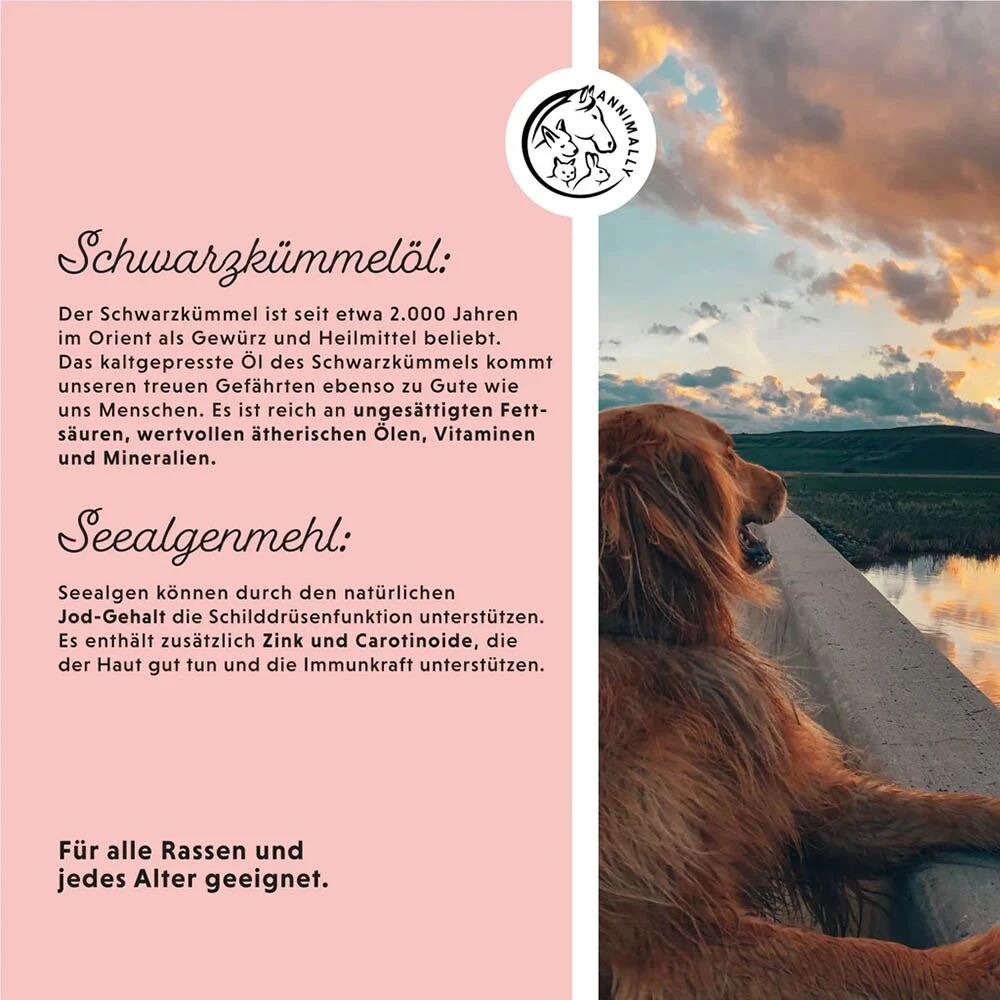 Bei Spaziergängen mit dem Hund im Grünen, auf Feldern, im Wald und hohem Gras, wenn die Sonne wieder scheint, ist unser Pulver eine natürliche Unterstützung ohne jegliche Nebenwirkungen, die dauerhaft dem Hund gegeben werden kann. Keine Chemie, keine Biozide, kein unnötiger Zusatz für den Hund. Die Verwendung von Zistrose geht bis in die Antike zurück. Diese essbare Pflanze enthält einen hohen Anteil an sekundären Pflanzenstoffen, den sogenannten Polyphenolen. Schwarzkümmelöl ist reich an ätherischen Ölen, ungesättigten Fettsäuren und Vitaminen und wird bereits seit 2.000 Jahren als Heilmittel eingesetzt.