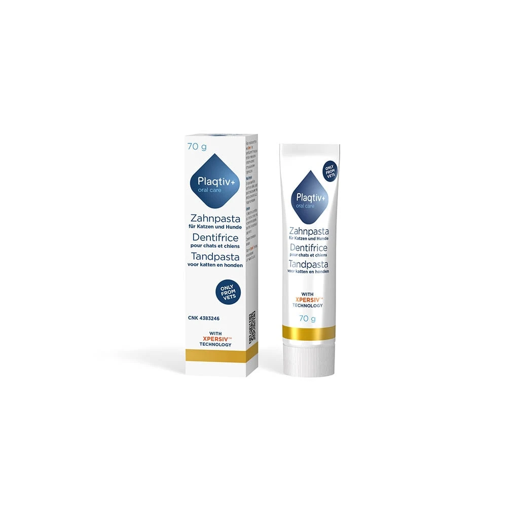 Plaqtiv+ ist eine innovative Zahnpfl egeserie, die auf Basis wissenschaftlicher Erkenntnisse entwickelt wurde und eine gute Maulhygiene unterstützt. Der Effekt von Plaqtiv+ basiert auf der einzigartigen Xpersiv™-Technologie. Der Xpersiv™-Komplex bindet Mineralien und hemmt so die Bildung von Zahnstein. Verwenden Sie eine erbsengroße Menge Zahnpasta und putzen Sie die Zähne Ihres Tieres. Ausspülen ist nicht erforderlich.