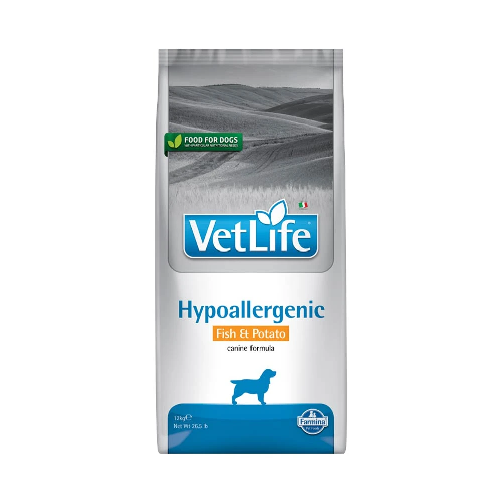 Farmina VetLife Hypoallergenic Fisch und Kartoffel ist ein diätetisches Futtermittel für ausgewachsene Hunde, um Futtermittelallergien und Futtermittelintoleranzen zu reduzieren. Unverträglichkeiten auf die Nahrung werden üblicherweise durch Residuen (Antibiotika, Antiparasitika und verschiedene Zusätzen) als Teil des normalen Futters verursacht, auf die der Hund allergisch reagiert. Farmina VetLife Hypoallergenic Eier und Kartoffel nthält nur ganze Eier als einzige Proteinquelle. Reis ist die einzige Stärkequelle. Außerdem verbessert der moderate Proteingehalt die hypoallergene Eigenschaften des Produktes. Die hohe Konzentration an essentiellen Fettsäuren sorgt dafür, dass weniger entzündliche Prozesse in der Haut auftreten.