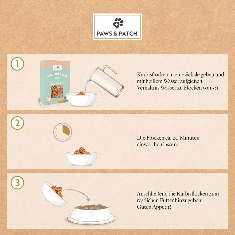 Viele am Markt erhältliche Gemüseprodukte für Tiere werden aus Asien importiert und oftmals mit Zucker bearbeitet. Für die Herstellung der PAWS&PATCH Kürbisflocken werden nur Kürbisse aus europäischer Landwirtschaft verwendet. Auch die Verarbeitung findet komplett in Europa statt. Die Kürbisse werden gewaschen und klein geschnitten. Am Ende des Verarbeitungsprozesses werden die Kürbisflocken mit heißer Luft getrocknet und thermisch verarbeitet, ohne dabei den natürlichen Geschmack zu verlieren. Bei Tieren mit empfindlichem Magen besteht zudem die Möglichkeit, die Flocken nach dem Quellen zu pürieren.