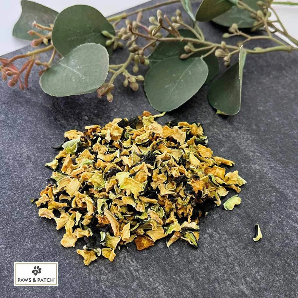 Die getrockneten Zucchiniflocken von PAWS&PATCH sind eine ideale Beilage zu selbstgekochtem Futter, BARF-Rationen oder zur Schonkost. Die Zucchiniflocken finden auch als Ergänzung von Trocken- oder Nassfutter Anwendung. Durch den hohen Vitamin- und Mineralstoffgehalt ist die Zucchini eine gern verwendete Gemüsebeilage. Die Zucchiniflocken sind leicht verträglich und kalorienarm.
