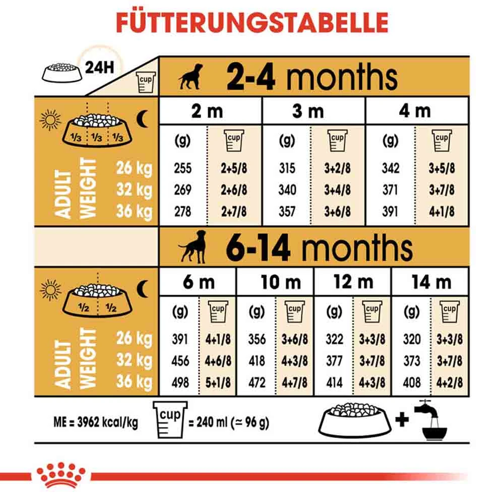 | Lebensmonat | Endgewicht 26kg | Endgewicht 32kg | Endgewicht 36kg |