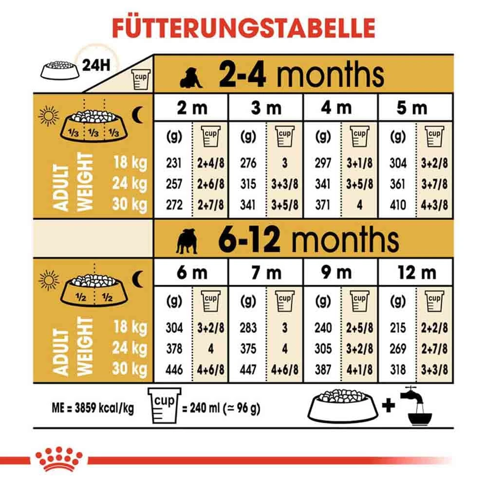 | Lebensmonat | Endgewicht 18kg | Endgewicht 24kg | Endgewicht 30kg |