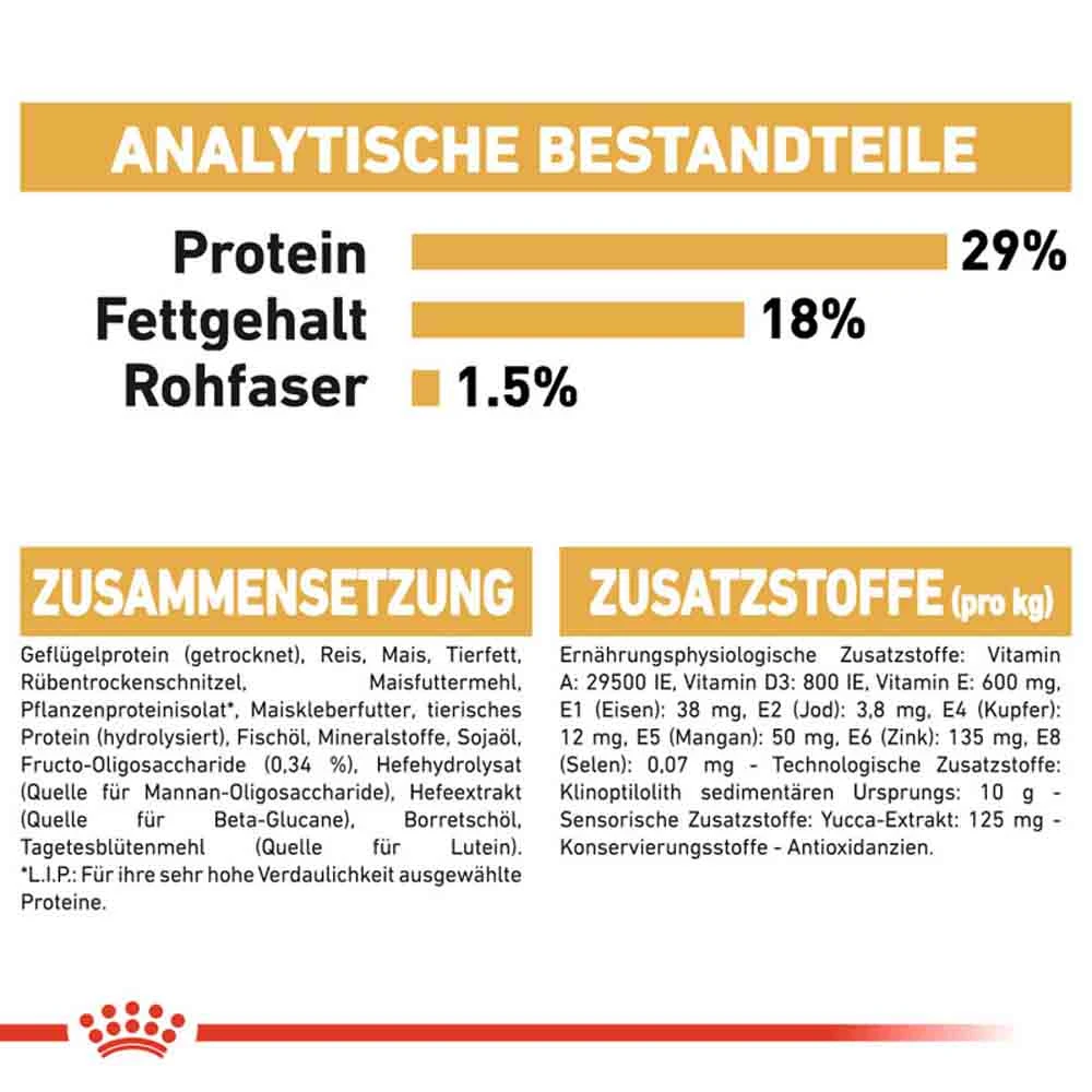 Geflügelprotein (getrocknet), Reis, Mais, Tierfett, Rübentrockenschnitzel, Maisfuttermehl, Pflanzenproteinisolat*, Maiskleberfutter, tierisches Protein (hydrolysiert), Fischöl, Mineralstoffe, Sojaöl, Fructo-Oligosaccharide (0,34 %), Hefehydrolysat (Quelle für Mannan-Oligosaccharide), Hefeextrakt (Quelle für BetaGlucane), Borretschöl, Tagetesblütenmehl (Quelle für Lutein).