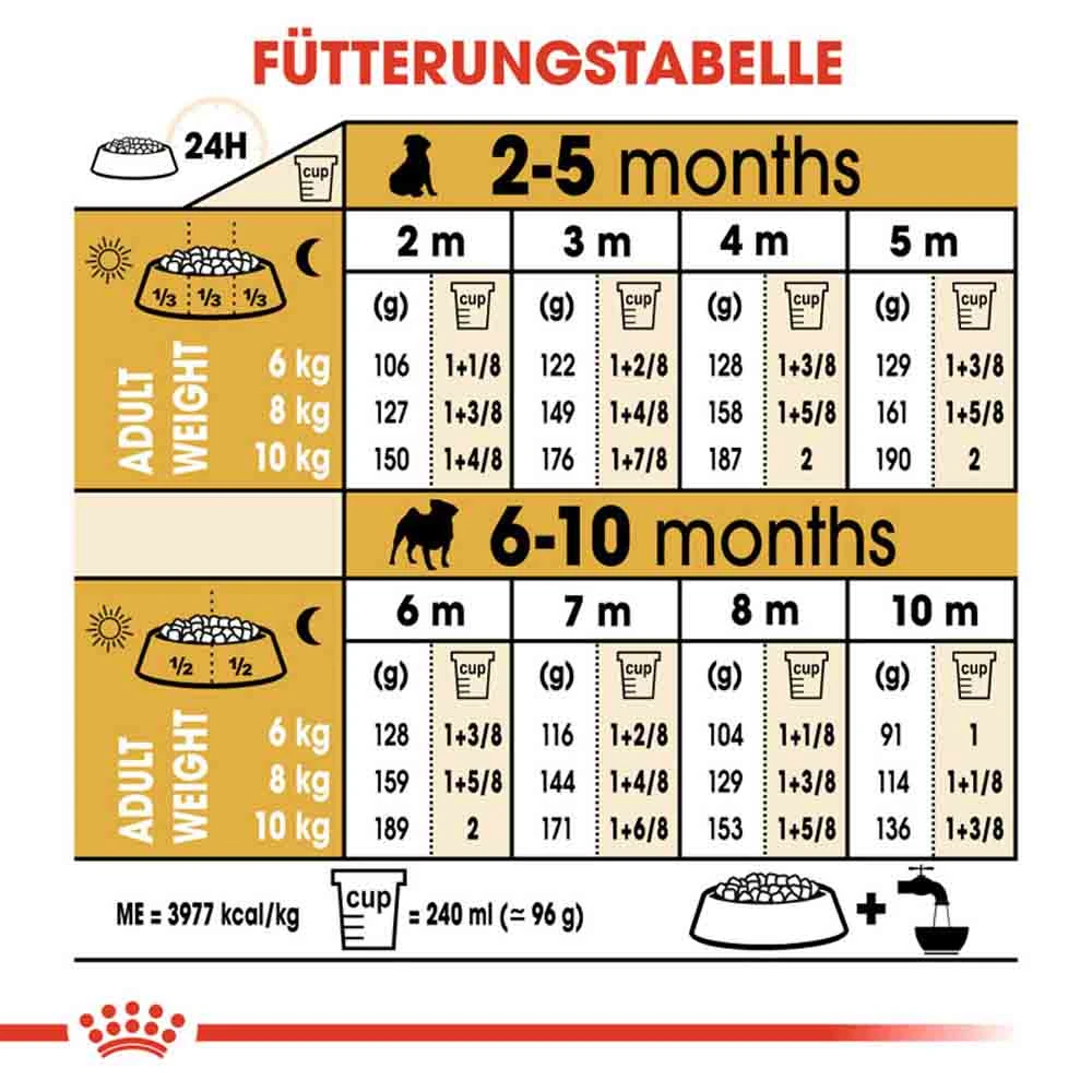 ROYAL CANIN Pug Puppy wurde speziell für Mops Welpen bis zu 10 Monaten entwickelt. Dank eines exklusiven Antioxidanzienkomplexes (einschließlich Vitamin E) hilft das Welpenfutter dabei, die körpereignen Abwehrkräfte zu unterstützen, während sie sich allmählich entwickeln. Weiterhin enthält ROYAL CANIN Pug Puppy eine spezielle Kombination von Nährstoffen mit hochwertigen Proteinen (L.I.P.), die speziell für ihre hohe Verdaulichkeit ausgewählt wurden.
